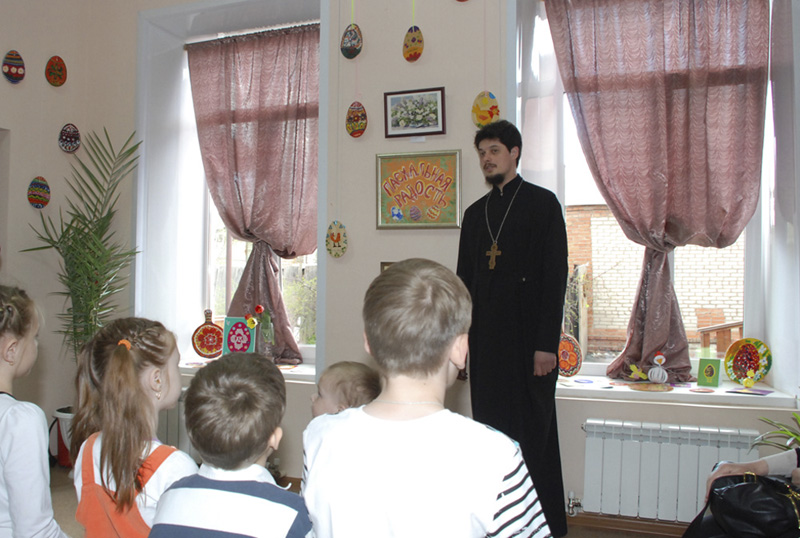 В качестве почетного гостя на выставке присутствовал клирик храма Преображения Господня иерей Александр Карпунин. Батюшка поблагодарил ребят за прекрасные работы, выполненные ко дню праздника праздников – Светлой Пасхе Христовой. Также отец Александр пояснил маленьким христианам, почему для православных этот праздник является самым главным.