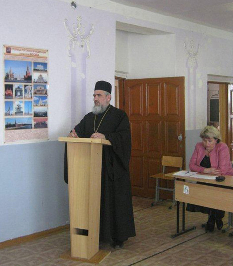 Отец Вячеслав встретился с родителями учащихся средней школы № 2 п. Адамовки. В своём выступлении священник донёс до собравшихся слушателей позицию Русской Православной Церкви о необходимости изучения курса «Основы Православной культуры» учащимися светской школы. В помощь отцу Вячеславу материалы доклада были предоставлены отделом образования и катехизации Орской епархии.
