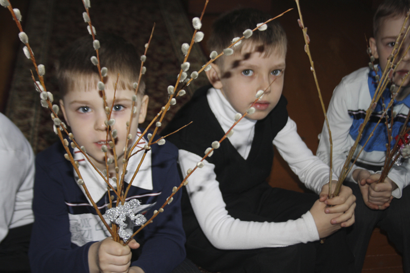 Как повествует Евангелие, вместе со взрослыми Господа встречали и дети. В нашем храме сегодня много прихожан с детьми, у всех в руках распустившиеся веточки вербы. У многих они украшены цветами и бусинками. Это постарались ученики и родители воскресной школы. Все с большим усердием трудились: папы поехали на речку и нарезали веточек, а дети с мамами готовили украшения для них. Получилось очень красиво и нарядно.