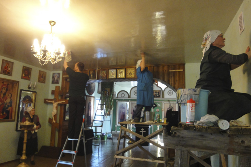 За эти две недели практически каждый прихожанин внес свою лепту в благоустройство храма. Кто-то отмывал потолки от копоти, чистил церковную утварь, кто-то ремонтировал, другие занимались благоустроительством церковного двора, приводили в порядок розы… Каждому нашлось дело. Даже наши старейшины, бабушки прихожанки, и те вышли поучаствовать в наведении порядка на территории вокруг церковного двора, невзирая на боли в пояснице и коленях.