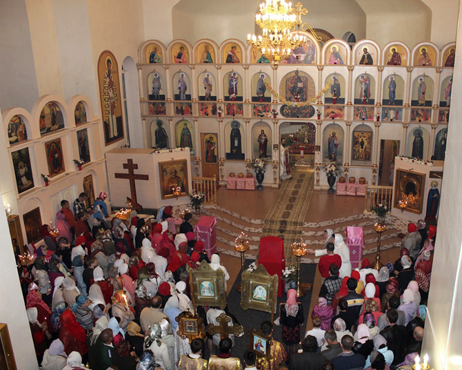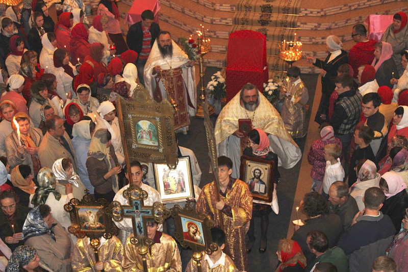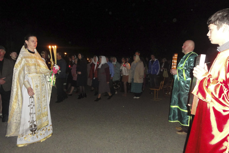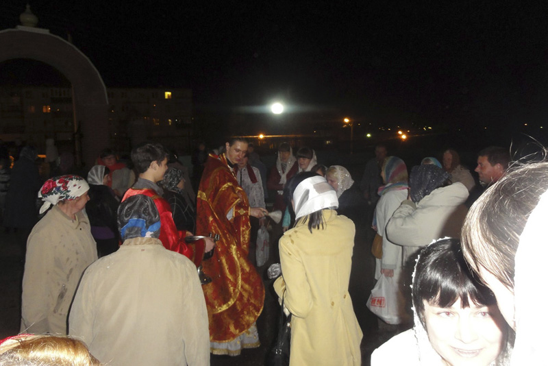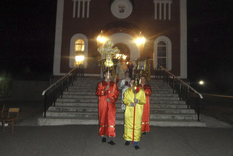Ровно в полночь священнослужители в праздничных облачениях в алтаре трижды пропели стихиру: «Воскресение Твое, Христе Спасе, Ангели поют на небесех, и нас на земли сподоби чистым сердцем Тебе славити». Затем, выйдя из алтаря, вместе с народом обошли вокруг храма крестным ходом с пением той же стихиры. Крестный ход вокруг храма был совершен трижды при непрерывном трезвоне колоколов, возвещающих о приближении воскресения Христова.