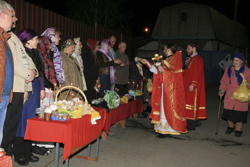 Пасху Христову верующие города Медногорска очень ждали и каждый как мог готовился к встрече Воскресшего Господа Иисуса Христа. И вот настал этот великий день. С одиннадцати часов вечера в храме святителя Николая Чудотворца г.Медногорска п.Заречного стали собираться прихожане. Родители с детками, бабушки с внуками, юные медногорцы – все нарядно одеты, на лицах – торжественность и радость. По окончании Полунощницы – крестный ход. Настоятель и алтарники – в белых облачениях, богомольцы несут зажженные свечи и фонарики. И вот из уст настоятеля храма иерея Андрея Пелипенко слышится долгожданное: «Христос воскресе из мертвых, смертию смерть поправ и сущим во гробех живот даровав!» И раскатистым громом летит среди прихожан: «Христос Воскресе! Воистину Воскресе!» Радость и ликование, братские объятия, благодатные слёзы! Пасхальная утреня проходит на одном дыхании, батюшка выходит из алтаря после каждой песни канона в разных облачениях: то в голубом, то в зелёном, то в золотисто-жёлтом и наконец в красном. По традиции батюшка кидает с амвона разноцветные яички, самым ловким счастливчикам удаётся поймать и разговеться ими дома. За Божественной литургией настоятель храма зачитал огласительное Слово святителя Иоанна Златоуста, по запричастном стихе – Пасхальное послание епископа Орского и Гайского Иринея. Освящались артосы, куличи, принесённая прихожанами снедь для разговления. Пасхальная радость переполняла сердца людей!