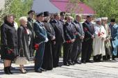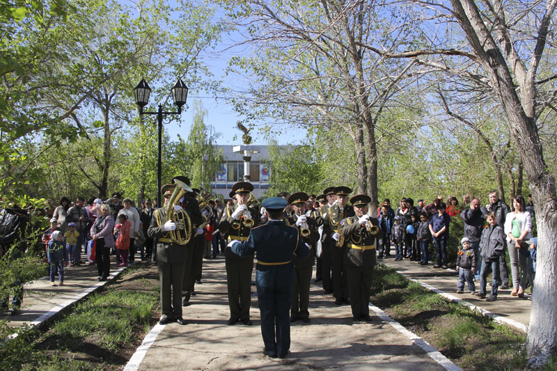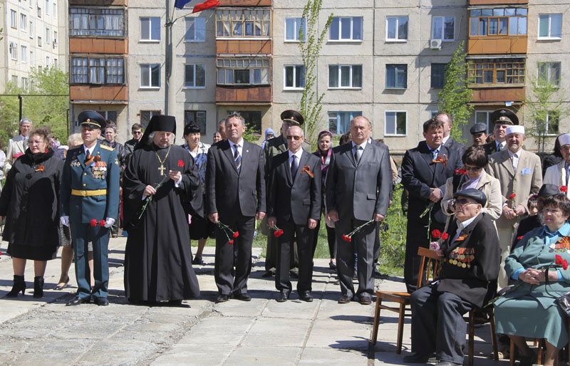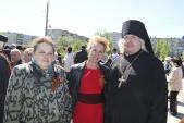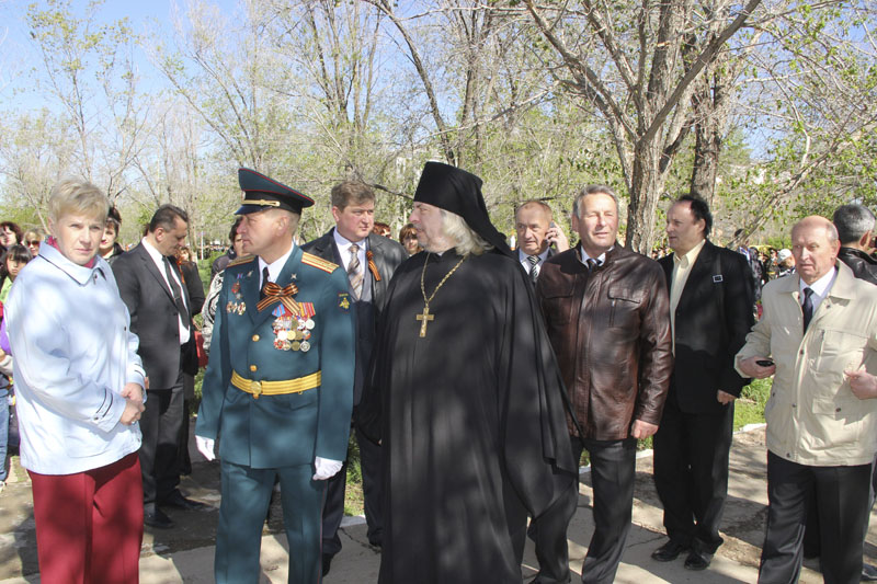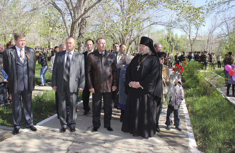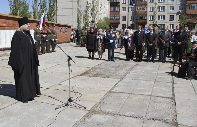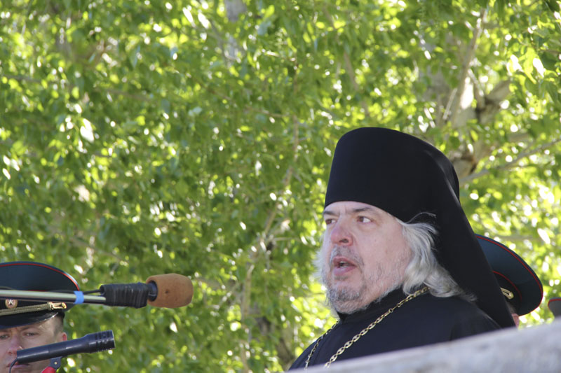 Военный парад уже в городе по благословению батюшки начался в 13.00 часов. Ракетная дивизия шла слаженно и организованно, администрация, батюшка, мулла поздравляли военных с днем Победы, возглашали приветствия военнослужащим.