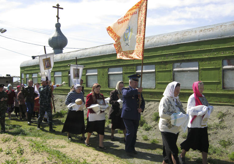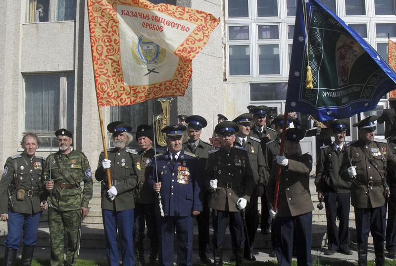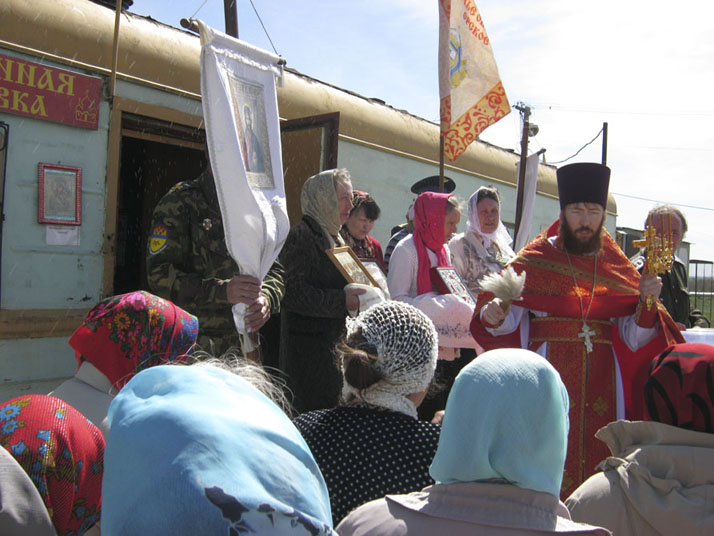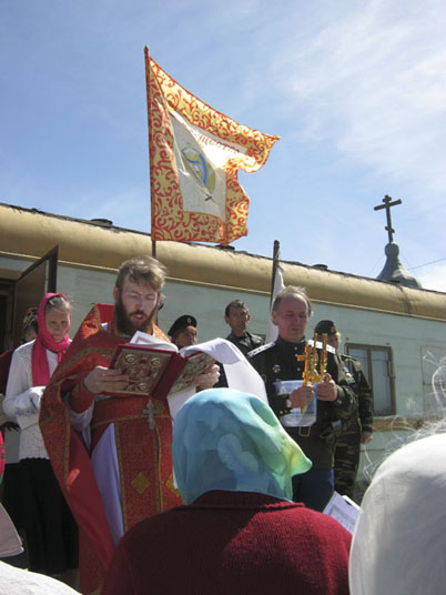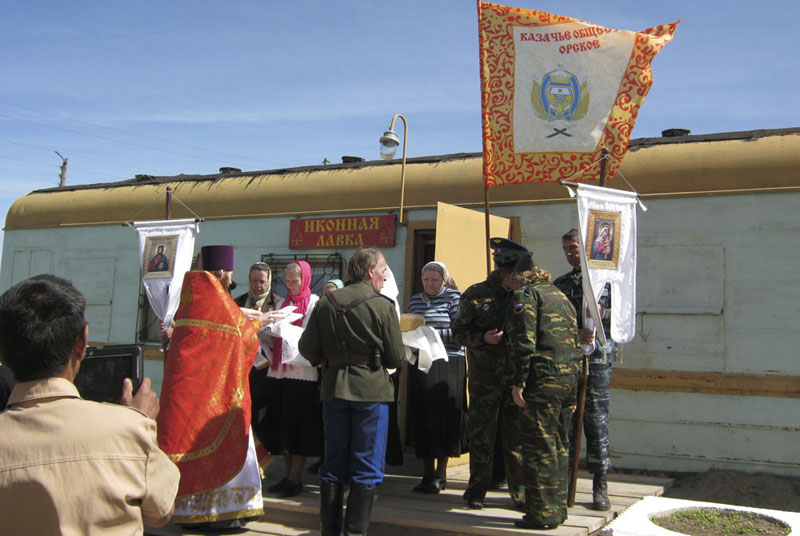 ОРСК. 10 мая 2013 г. В пятницу Светлой седмицы, в празднование чудотворной иконы Божией Матери «Живоносный Источник», в храме Архангела Михаила г. Орска (п.Степной) была отслужена Божественная литургия, после которой состоялись водосвятный молебен, крестный ход, освящение походного знамени и награды казачьего хутора «Орский».