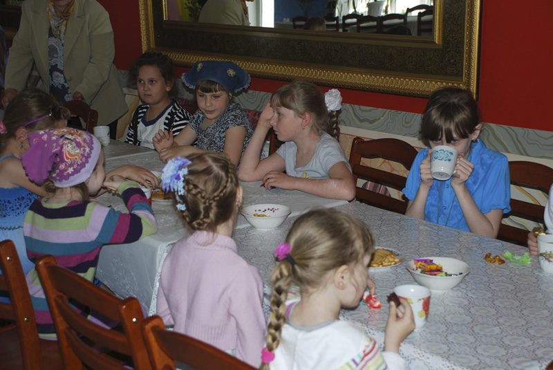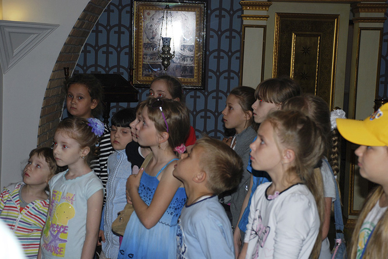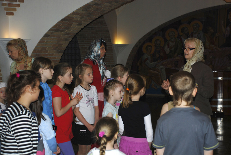 Из храма ребята направились в здание Центра. Кто-то из маленьких гостей, впервые оказавшихся на территории кафедрального собора, спросил: "Мы идем в ресторан?". Видимо, настолько красивым показалось им это здание, что возникла такая ассоциация. Здесь уже роль рассказчика взяла на себя Ольга Лебеденкова. Экскурсия была адресована скорее гостям, так как им, несомненно, было интересно, что есть в этом здании и как оно устроено. Девочки церковного хора, у которых в это время шло занятие, под руководством своего педагога Елизаветы Вольшонок как всегда прекрасно исполнили для гостей "Богородице Дева, радуйся...".