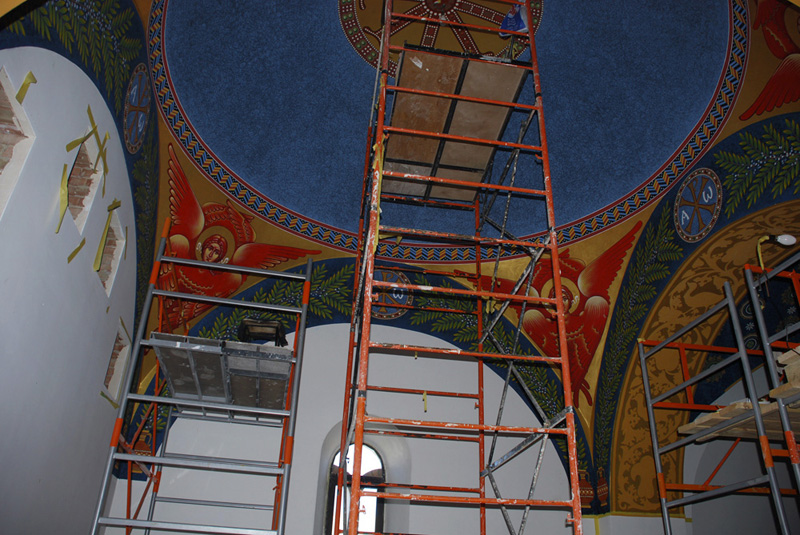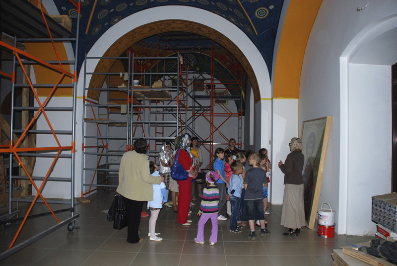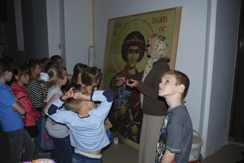 У ребят появилась возможность увидеть, как будет выглядеть храм после завершения работ. К сожалению, фотографии не могут в полной мере передать величия и красоты, представшей перед глазами посетителей. Остановившись возле иконы св. вмч. и Победоносца Георгия, превышающей рост человека, ребята узнали о житии этого святого. Юных художников очень заинтересовало, как можно создать такую большую икону. Ольга Вячеславовна пояснила, что только через пост и усиленную молитву художник получает помощь Божию при написании иконы.