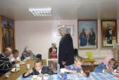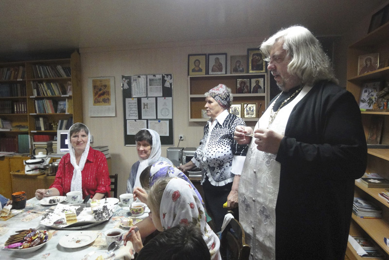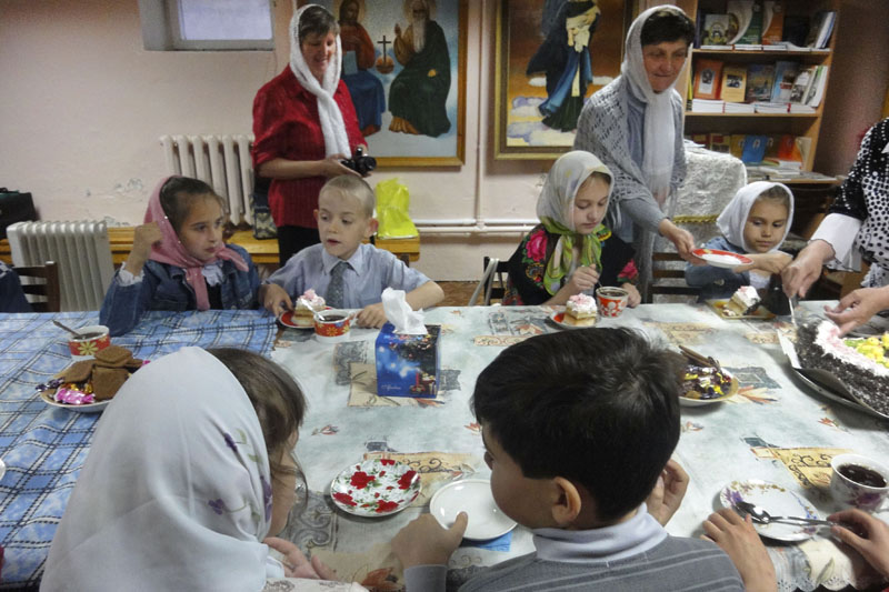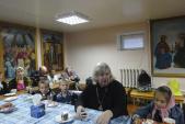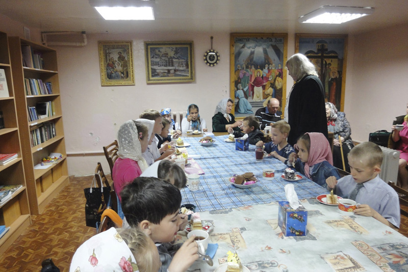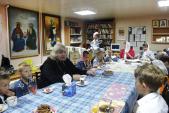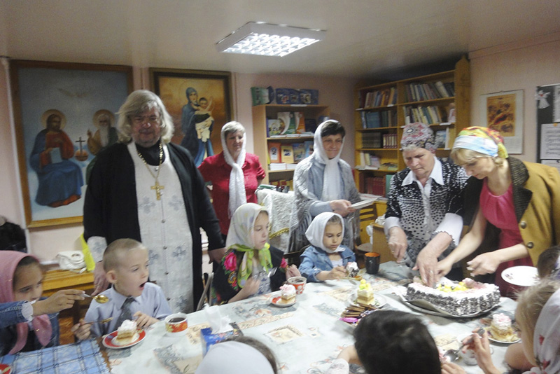 К заключительному чаепитию, да еще с приглашенными прихожанами пос. Еленовского, в приходе готовились очень основательно. Сестра-хозяйка храма Ираида Игнатова собрала свою команду, совместно с которой был приготовлен сладкий стол. Торт заказывали по эскизам: с цыплятами, розочками, орнаментом – огромный, красочный и вкусный.
