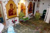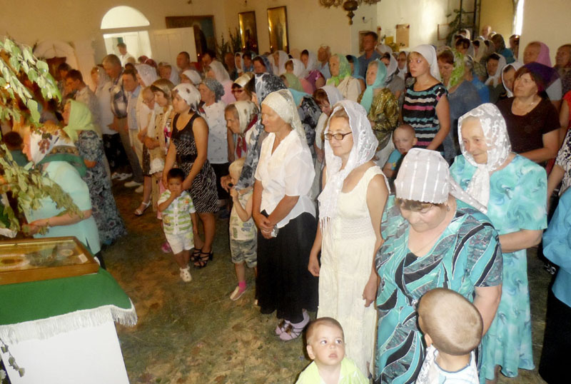 Прихожане храма святых апостолов Петра и Павла принесли березовые ветки и зелень, которыми украшалось убранство храма, по полу в храме разложена трава. Храм, как украшенная невеста, утопал в зелени и аромате скошенной травы.