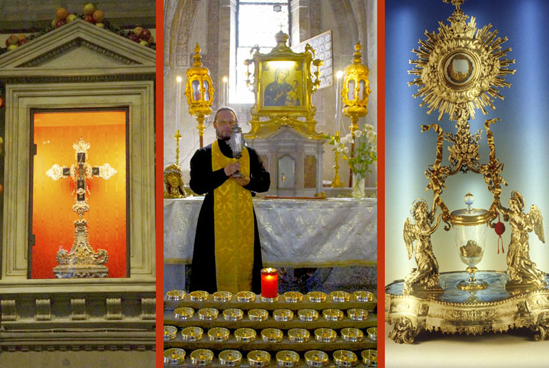 Следующей нашей остановкой была церковь Евхаристического Чуда в Ланчано, где вот уже 12 веков хранятся чудесные Кровь и Плоть Христовы, материализовавшиеся во время Евхаристии. Святые Дары, хранящиеся в Ланчано с VIII века, представляют собой подлинные человеческие Плоть и Кровь. Плоть является фрагментом мышечной ткани сердца, содержит в сечении миокард, эндокард и блуждающий нерв. И Плоть, и Кровь относятся к единой группе крови: АВ. К ней же относится и Кровь, обнаруженная на Туринской Плащанице. Кроме того, Кровь, будучи приведена в жидкое состояние, остается пригодной для переливания, обладая всеми свойствами свежей крови. То есть речь идет о крови и о плоти живого человека, живущего сейчас, т. к. кровь соответствует той, которая была взята в этот же день у живого человека! А мы получаем в Евхаристии ту же самую живую Плоть не из мертвого, но из живого и прославленного Тела, чтобы жить жизнью Христа. Со страхом и трепетом приложившись к таким великим святыням, мы начали приготовлять себя к исповеди Божественной литургии, назначенной на следующий день.