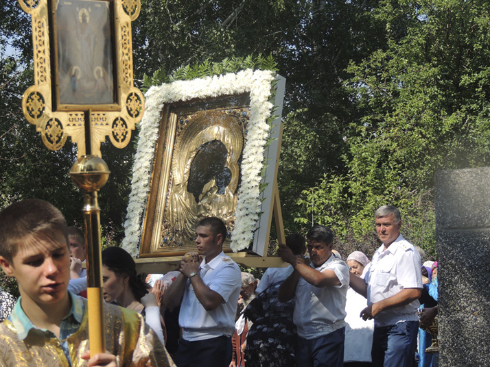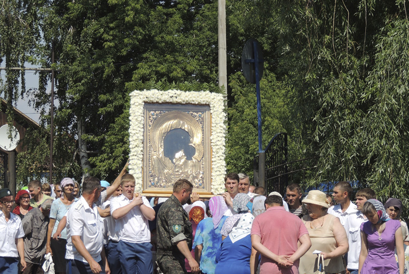 КУВАНДЫК. 5 июля 2013 года. По сложившийся доброй традиции ежегодно после Литургии приходом храма Покрова Пресвятой Богородицы осуществляется крестный ход по городу в честь иконы Божией Матери «Табынская».