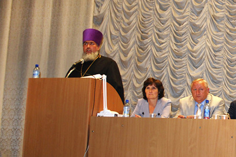 АДАМОВКА. 29 августа 2013 г. В РДК «Целинник» состоялось августовское совещание работников образования Адамовского района «Состояние и перспективы образовательной системы Адамовского района в условиях модернизации». В работе совещании принял участие благочинный Адамовского округа иерей Вячеслав Кочкин, который зачитал доклад епископа Орского и Гайского Иринея «Духовно-нравственное образование и воспитание школьников в условиях внедрения ФГОС нового поколения».