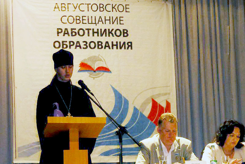 После основного доклада начальника отдела образования города Олега Михайлова слово было предоставлено священнику. В своем выступлении отец Александр освятил проблемы интернет зависимости, неуважительного отношения к родной культуре, которая является выражением внутренней духовной жизни народа. Священник призвал педагогов с большим вниманием относиться к каждому ребенку и искать к нему индивидуальный подход. А для этого необходимо иметь авторитет и уважение в глазах школьников. Также было обращено внимание на совершенствование личности самого педагога, который является примером для подражания многих детей и подростков.