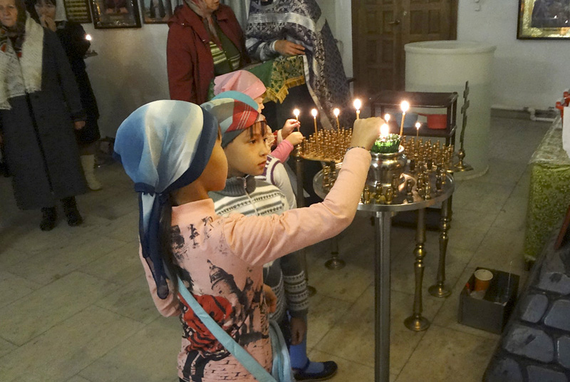 Во время Литургии мальчики воскресной школы прислуживали в алтаре, читали Апостола, девочки пели на клиросе, смотрели за подсвечниками и порядком в храме.