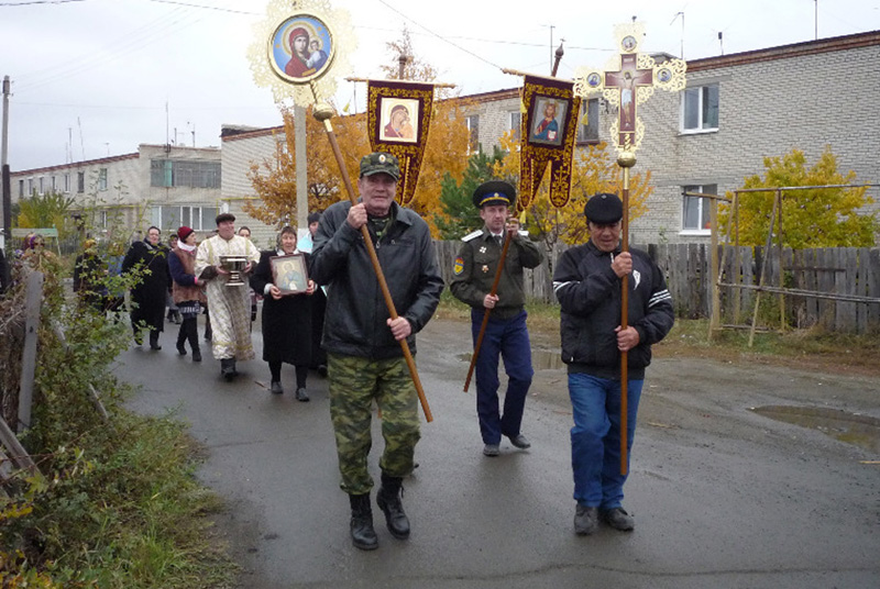 После Божественной литургии и молебна с водоосвящением был совершён крестный ход по селу Хабарному. В этот раз в крестном ходе принимали участие казаки во главе с атаманом.
