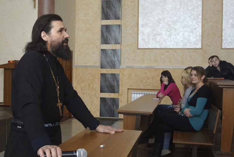 НОВОТРОИЦК. 22 октября 2013 г. В рамках проведения профилактики детской преступности благочинный Новотроицкого округа, настоятель прихода храма святых апостолов Петра и Павла г. Новотроицка иерей Сергий Кваша провел беседу в Новотроицком политехническом колледже среди учащихся второго и третьего курсов.