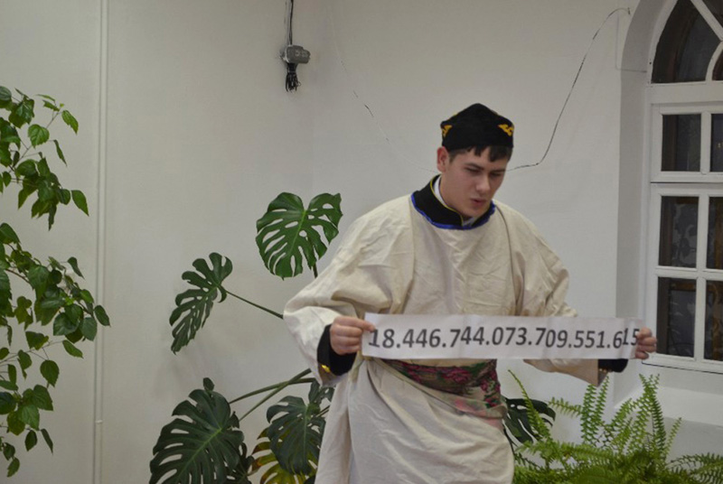 В гости к ребятам пришел великий ученый Пифагор и раздал задания каждому классу. В течение недели ребята выпускали газеты «Математики России», листовки «В мире больших и малых чисел», участвовали в викторине «Умничка», конкурсе «Задача дня» и др. В заключение недели ребята показали спектакль «Математика - царица наук», в котором каждый класс представил сценку о математиках, об интересных задачах и математических курьезах. Все классы приняли активное участие. Лучшими математиками гимназии признаны Анна Бурумбаева, Николай Дулин, Антонина Хлоповских, Мария Якутина, Дарья Сопига, Иван Гузь.