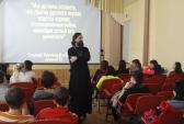 В этот раз отец Сергий посетил Новотроицкий строительный техникум, в котором собрались студенты разных курсов. Перед беседой был показан фильм по проекту «Общее дело», в котором авторы рассказывают о последствиях употребления алкоголя на организм в младшем школьном и в продуктивном возрасте. Лекция священника сопровождалась презентацией.