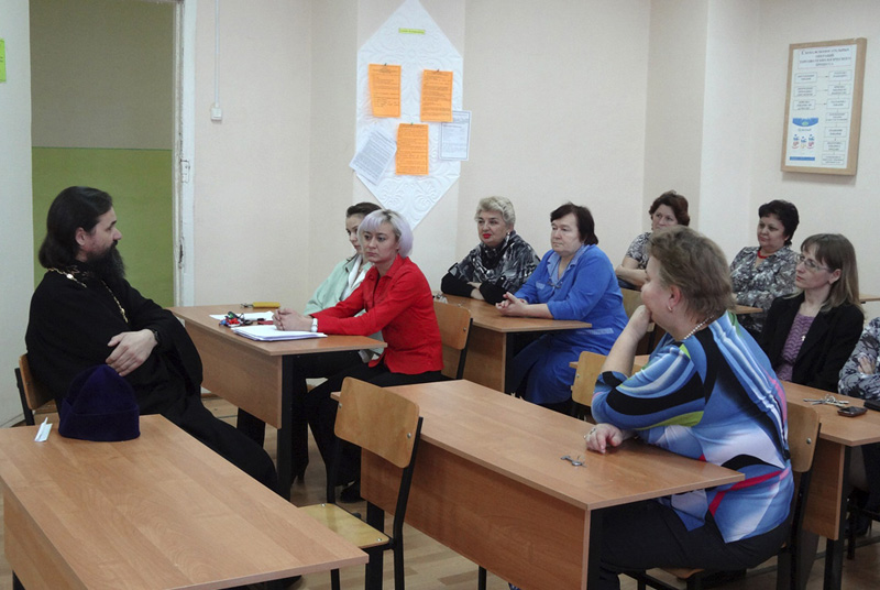 НОВОТРОИЦК. 29 ноября 2013 г. Во втором корпусе Новотроицкого политехнического колледжа состоялась встреча преподавателей с благочинным Новотроицкого округа, настоятелем прихода храма святых апостолов Петра и Павла г. Новотроицка иереем Сергием Квашой.