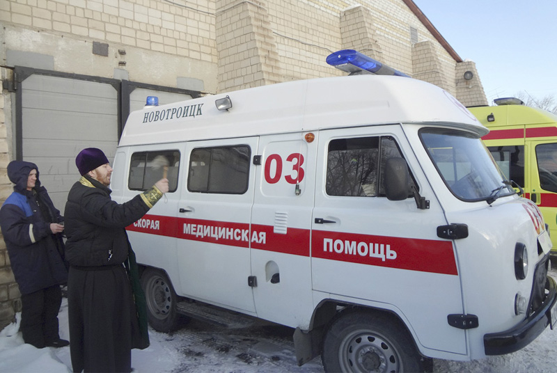 НОВОТРОИЦК. 26 декабря 2013 г. Клирик собора святых апостолов Петра и Павла г. Новотроицка иерей Сергий Новиков освятил машины «Скорой помощи».