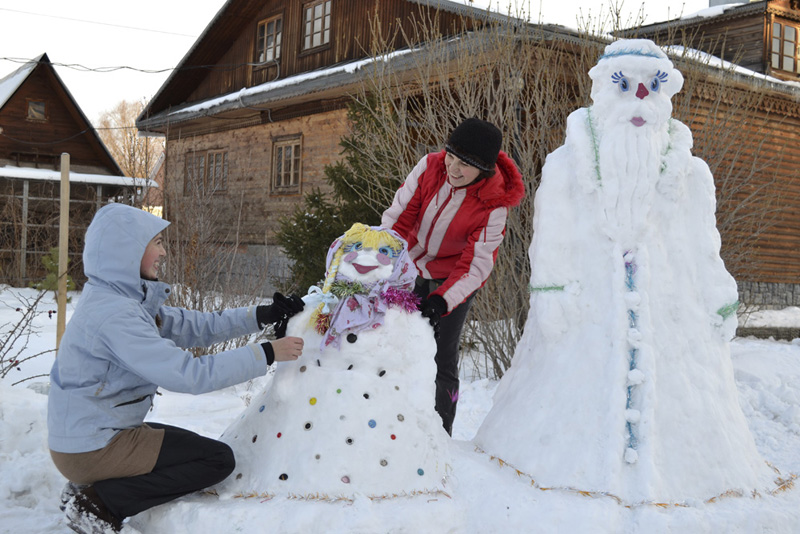 А на территории кафедрального собора растет сказочный необычный снежный городок. Прихожане храма лепят из снега забавных снеговиков. Здесь фигурки и деда-мороза со снегурочкой, и веселых старичков и Марфушек-веселушек. Скоро появится ледяная горка и рождественский вертеп.
