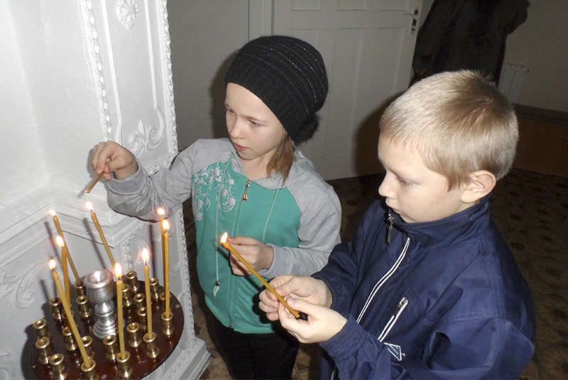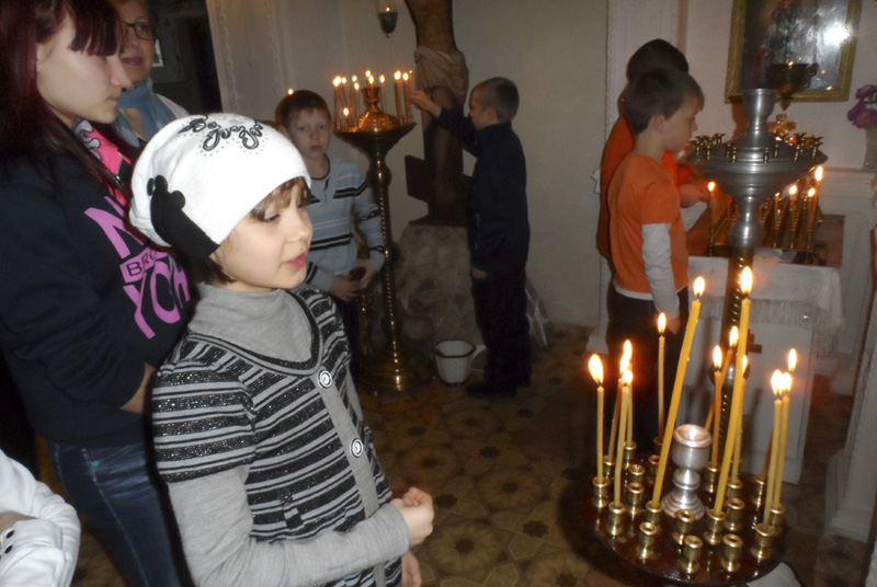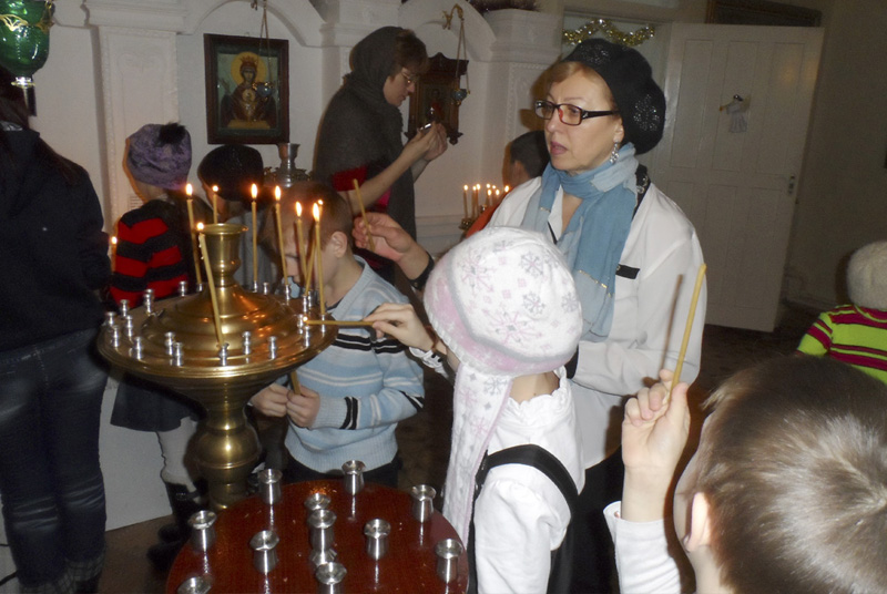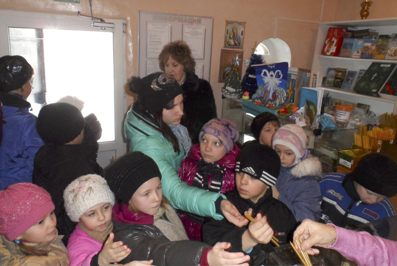 Во время экскурсии дети осмотрели внутреннее устроение и убранство храма, услышали о церковном благочестии. Ребята узнали, что традиция украшать ветви елок поучительно показывает: наша природа - бесплодная и безжизненная ветвь. Только во Иисусе Христе - источнике жизни, света и радости - можем принести духовные плоды: веру, любовь, молитвы и добрые дела. Перед иконами и святынями мальчики и девочки помолились о своих родителях и сродниках, поставили свечи, приобретенные на средства прихода.