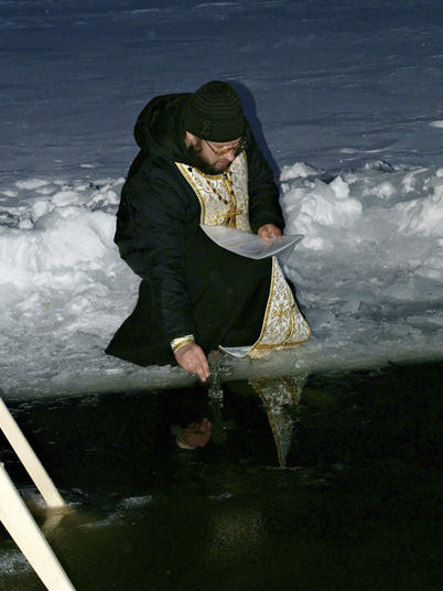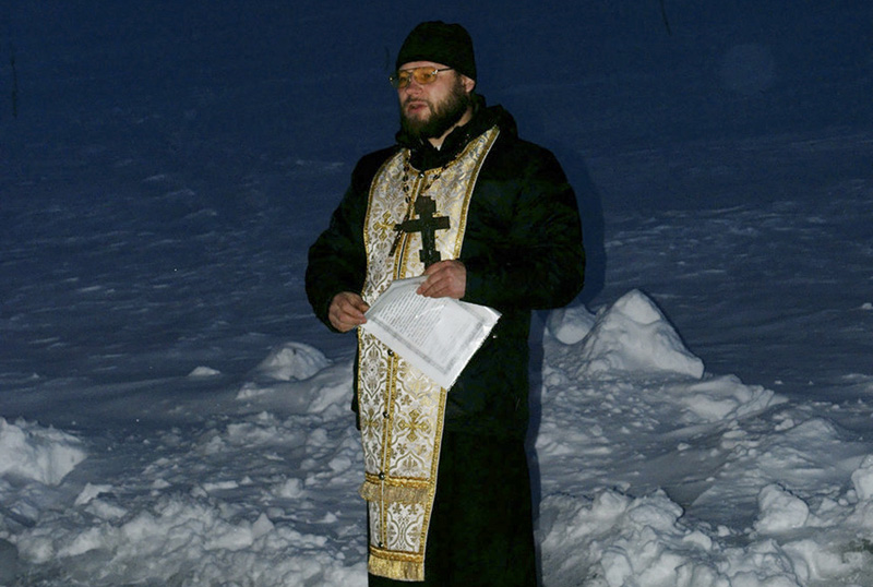 ОРСК. 18 января 2014 г. Вечером, после окончания всенощного бдения, клирик кафедрального собора святого Георгия Победоносца иерей Олег Соболевский совершил освящение воды на озере Песчаном, что в парке Строителей.