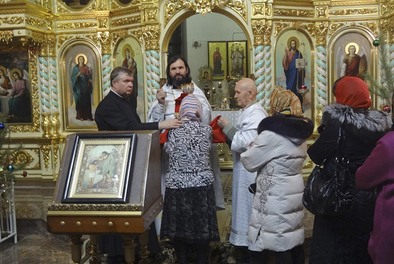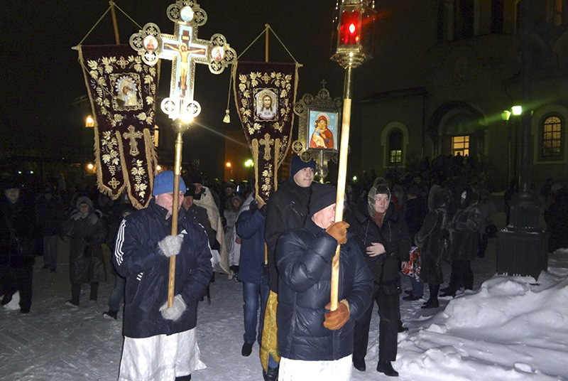 НОВОТРОИЦК. 19 января 2014 г. В день праздника Крещения Господня в соборе святых апостолов Петра и Павла г. Новотроицка служба началась 18 января за два часа до полуночи и длилась до трёх часов утра следующего дня. Храм был полон верующими жителями города Новотроицка. Немало их было и на улице.
