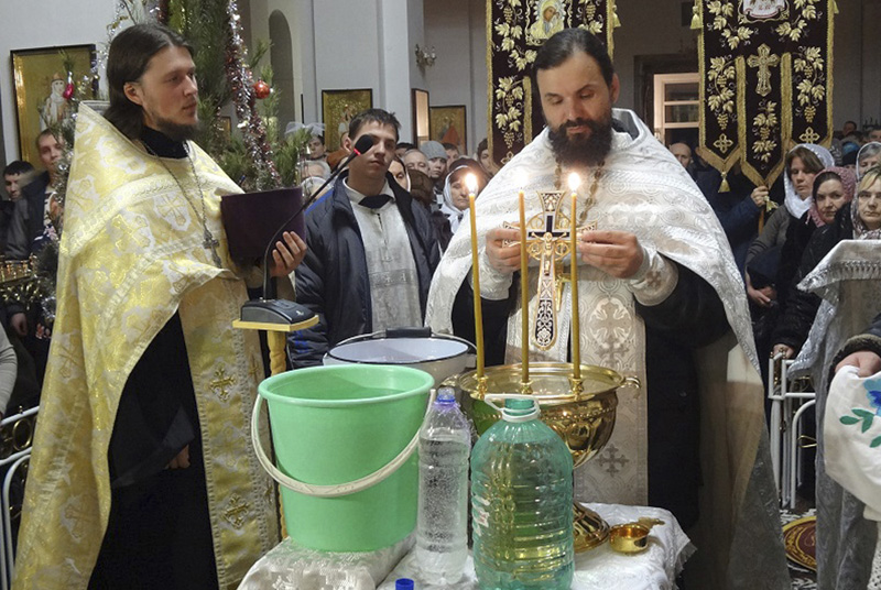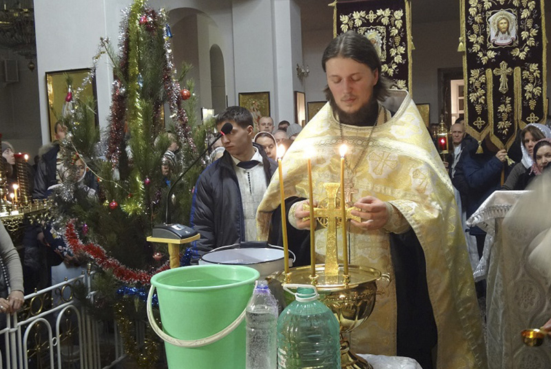 По окончании Божественной литургии настоятелем собора иереем Сергием Квашой и клириком иереем Максимом Бражниковым был совершен чин великого освящения воды в храме, а затем и в водосвятной часовне, расположенной на территории храма. Прихожане с хоругвями и иконами направились крестным ходом на иордань для освящения крещенской купели.
