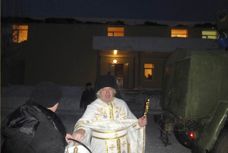 В полдень отец Онисим поехал освящать иордань, подготовленную местным предпринимателем. Здесь собрались отцы городов, района, военные, ведущие специалисты.