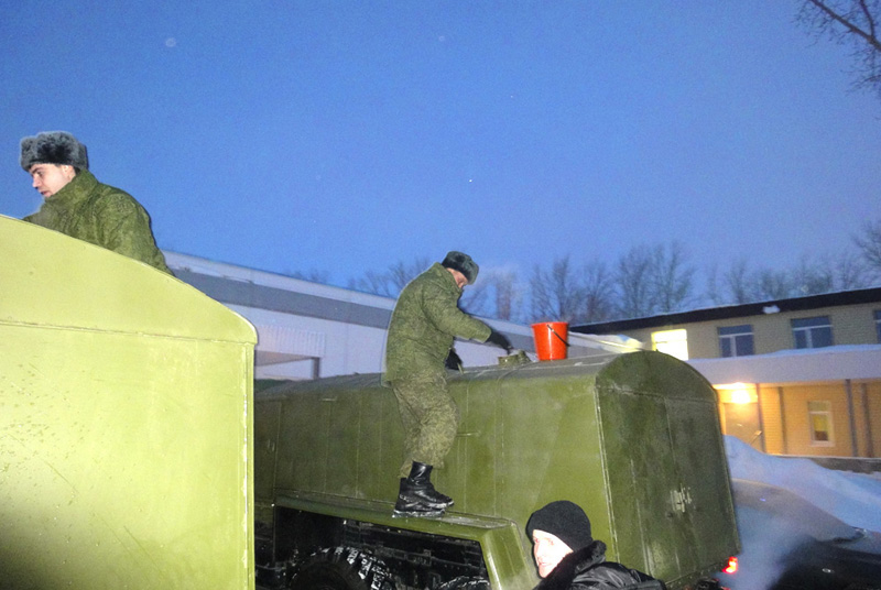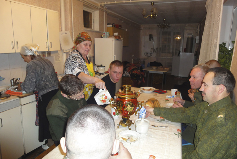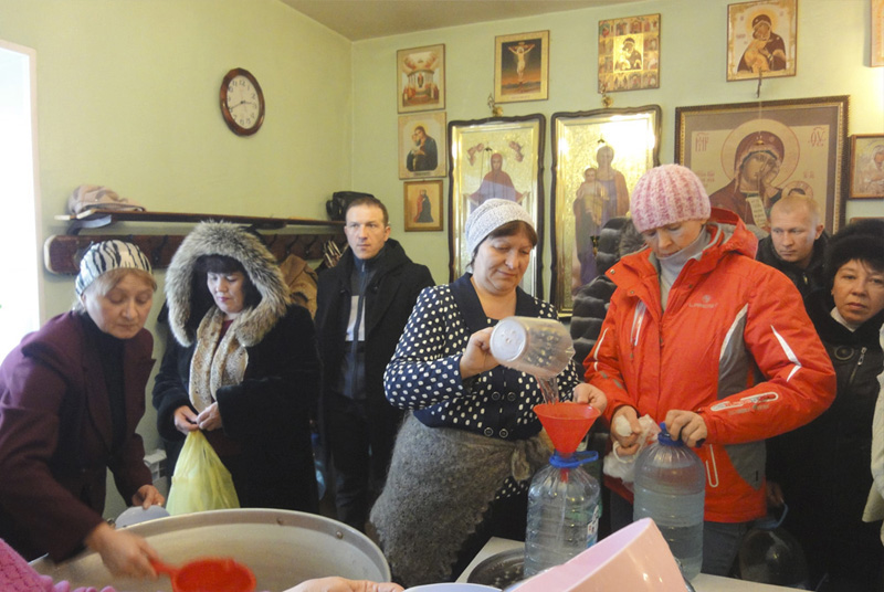 В течение всего дня военнослужащие и казаки носили воду в храм, обеспечивали порядок, а наши стойкие работницы трапезной трижды покормили их вкусно, по-домашнему. Солдаты так и говорили: «Большое спасибо вам! Как будто мама приготовила вкусный домашний обед и ужин». Надо сказать, что работали все очень добросовестно. Очередь за великой агиасмой начала спадать только к пяти часам вечера. Теперь у распространителей появилась возможность подробнее отвечать на вопросы жителей и беседовать индивидуально о молитвах, иконах и церковных традициях.
