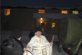 После Литургии началось великое освящение воды. Игумен Онисим вышел на улицу, где уже были подготовлены шесть цистерн с водой, привезенной ночью военными с артезианской скважины. Освятив воду, батюшка вернулся в храм, где люди начали подходить ко кресту, щедро и празднично окропляемые крещенской водой.