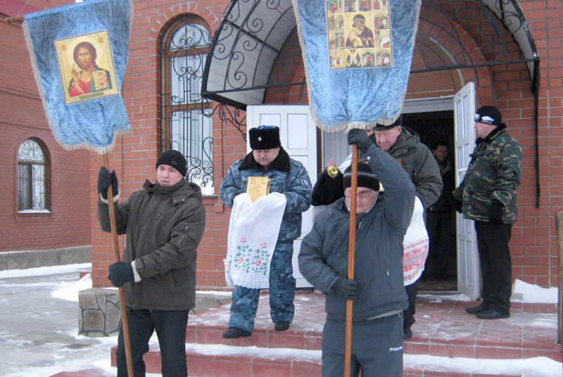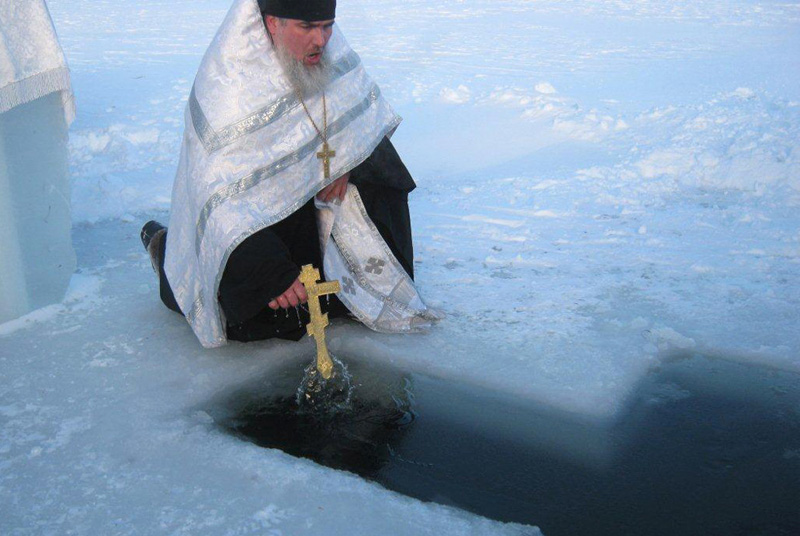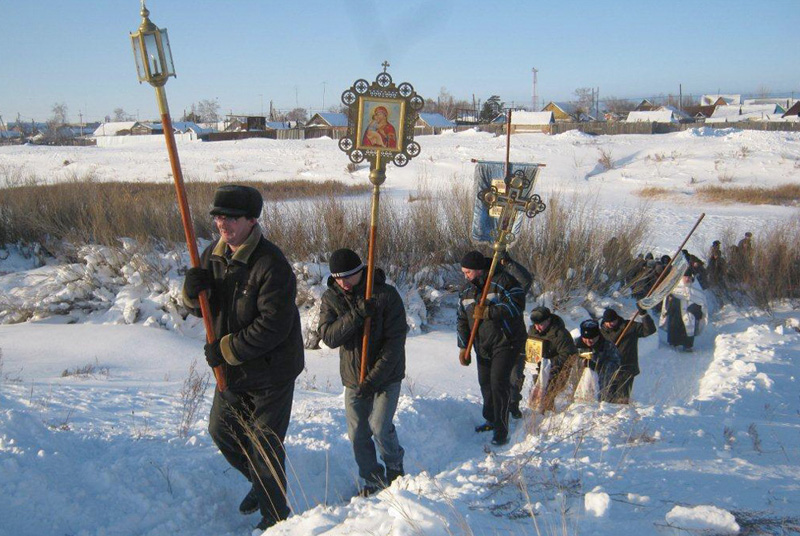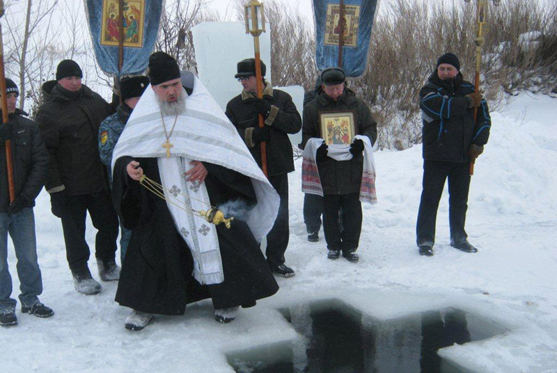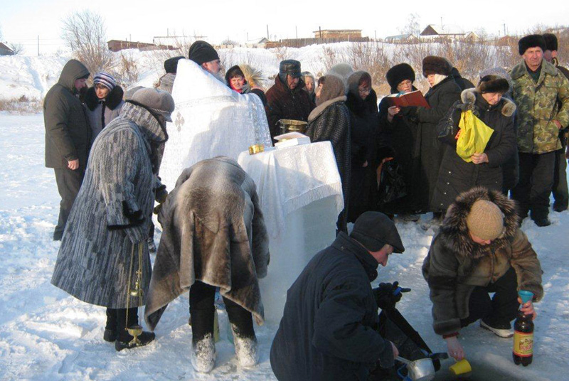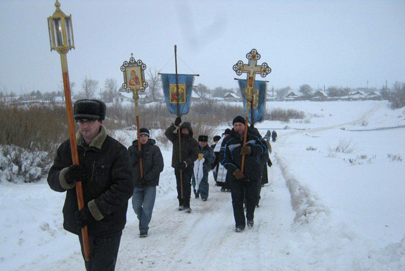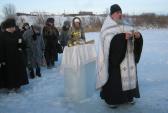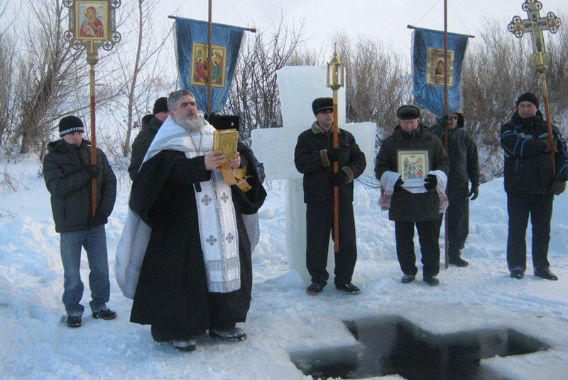 После праздничного богослужения прихожане, торжественно неся иконы и хоругви, отправились крестным ходом на реку Жарлы. Здесь у купели, вырубленной в форме креста, отец Вячеслав совершил чин великого освящения воды. По освящении собравшиеся с большим вниманием выслушали проповедь о значении крещенской воды и правилах её употребления.