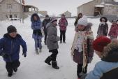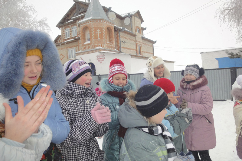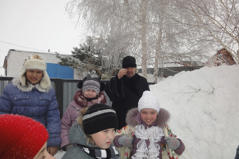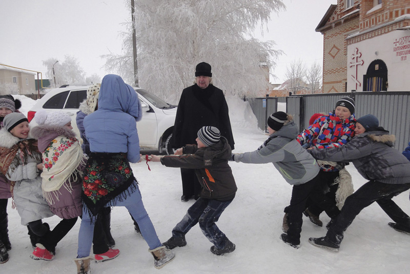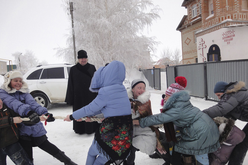 Это задорные игры на улице, шутливое перетягивание каната, пускание мыльных пузырей, припевки, хороводы, веселая игра в Царя горы на самом высоком снежном сугробе у храма. Вначале учитель Валентина Жданова устроила конкурс «Кто лучше знает события Нового Завета?» в приходской библиотеке. Потом, пригласив игумена Онисима как судью и благодарного зрителя в народных играх, ребята высыпали на улицу и началось веселье. Детский смех и радость у православного храма были искренни и чисты, а священник благословлял воспитанников на удачу, победу в игре.