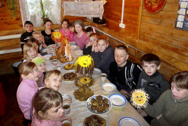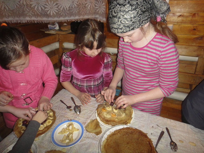 По сложившейся традиции ребята вместе со взрослыми выпекали блины, делали из них торты, которые украшали фруктами, сгущенным молоком, орехами и другими продуктами. Все сделанные детскими руками блинные тортики и рулетики были дружно съедены за праздничным чаепитием.