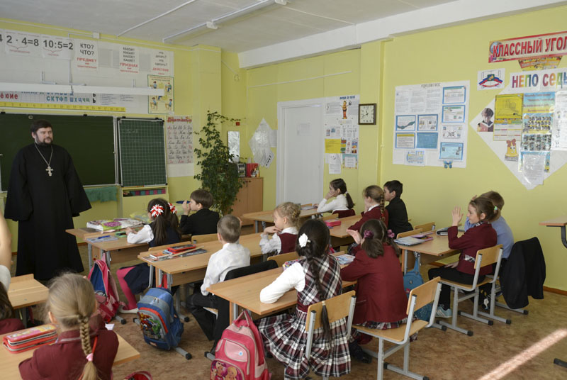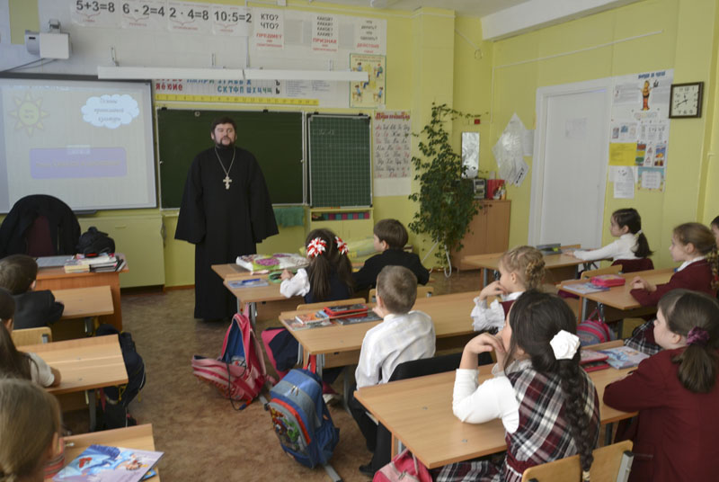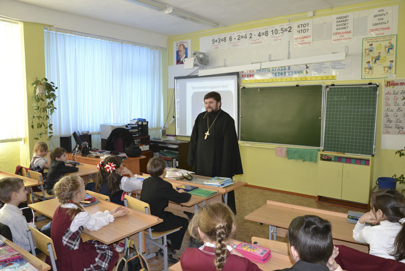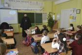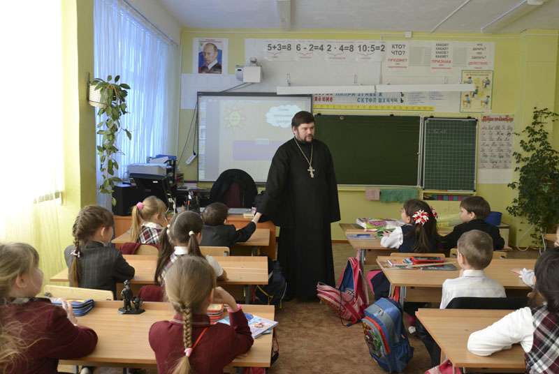 МЕДНОГОРСК. 28 февраля 2014 г. Настоятель храма святителя Николая Чудотворца г. Медногорска п. Заречного иерей Андрей Пелипенко провел беседу с учениками 2 «Б» класса Гимназии г. Медногорска.