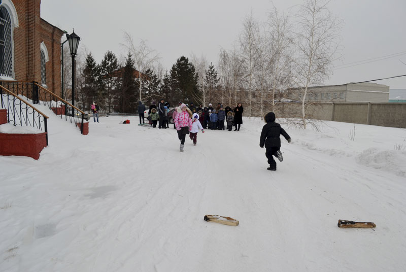 Праздник начался сразу после Божественной литургии, и к восторгу детей веселье проводилось на улице. Педагог младшей группы Елена Иляева рассказала о масленичной (сырной) неделе, об истории празднования Масленицы на Руси, об отличиях православного праздника от языческого. Рассказала Елена Викторовна также и о Прощеном воскресении.