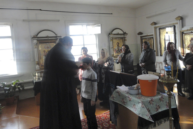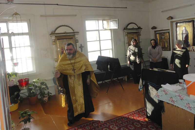 В сельской молитвенной комнате во имя святой блаженной Матроны Московской отец Антоний совершил водосвятный молебен и заупокойную литию. Девять человек пришли помолиться вместе с батюшкой. Из них восемь приняли участие в таинстве Причащения. После богослужений батюшка пообщался с верующими, дав им необходимые наставления, ответив на волнующие вопросы.
