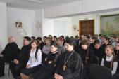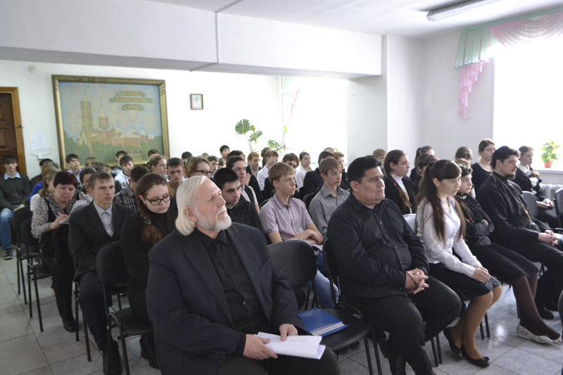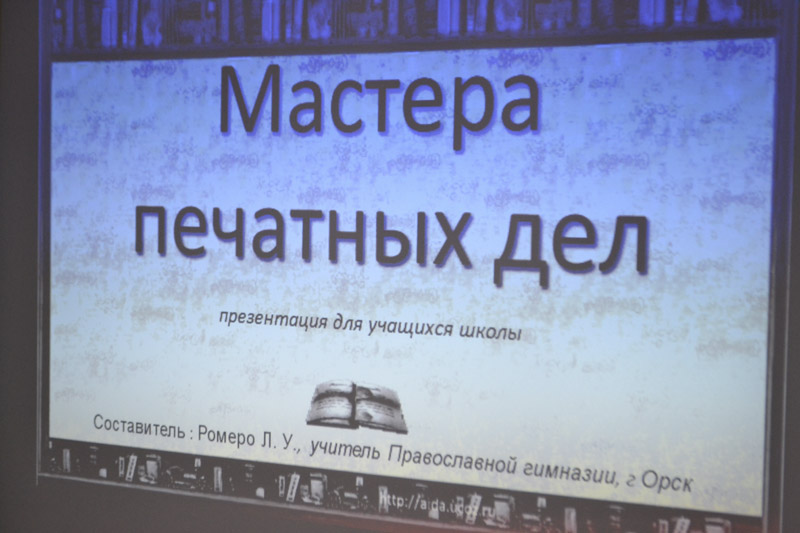 В актовом зале православной гимназии собрались гимназисты, учащиеся школы № 49 и студенты индустриального колледжа. Перед присутствующими выступил учитель истории, религиовед Лестор Умбертович Ромеро. Он рассказал о первопечатнике Иване Федорове, отметив, что православная книга – это, прежде всего, духовное наследие святых отцов и учителей церкви, наследие подвижников благочестия. Преподаватель гимназии, член литературного городского объединения Ю. Безус презентовал рукописную книгу стихов «Души целительная сила», где присутствует мысль о Боге, идея Бога, признание Бога, вера в Бога, любовь к Богу. Ученица 9 класса А. Бурумбаева выступила с сообщением о первых православных книгах.