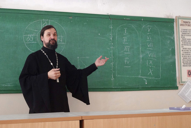 Перед совершением чина освящения отец благочинный побеседовал с педагогическим коллективом гимназии. Преподаватели узнали, для чего священники освящают здания, какая от этого будет польза. Батюшка рассказал собравшимся о том, как стоит грамотно поставить себя в этой жизни, чтобы самому себе не навредить, то есть соблюдать заповеди Божии. Педагоги вместе со священником подробно разобрали все десять заповедей, которые Господь дал пророку Моисею на горе Синай. Отец настоятель объяснил учителям, как необходимо вести себя в освященном здании: Бог от нас ждет, чтобы мы были добрыми людьми, чтобы строили свою жизнь по заповедям Божиим.