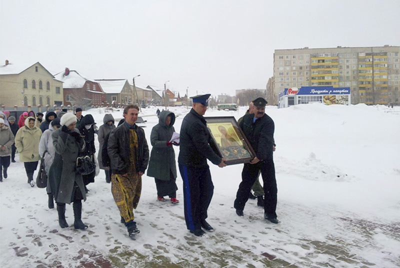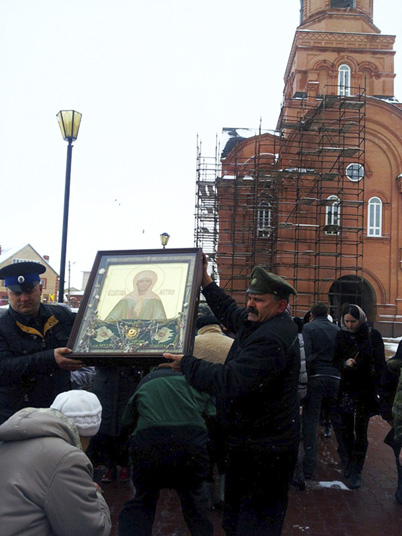 ГАЙ. 31 марта 2014 г. В кафедральном соборе святого праведного Иоанна Кронштадтского верующие с молебным пением встретили святыню - икону с частицей мощей блаженной Матроны Московской. Образ доставлен из Михаило-Архангельского храма поселка Зирган Салаватской и Кумертауской епархии Башкортостанской митрополии.