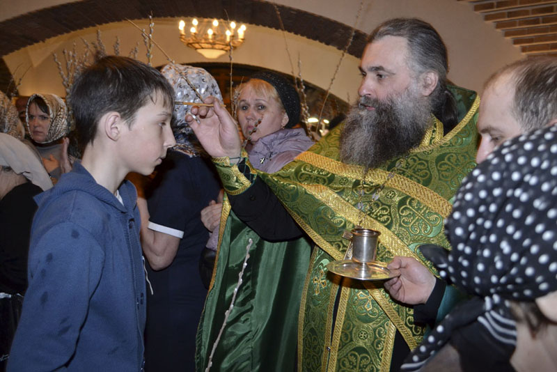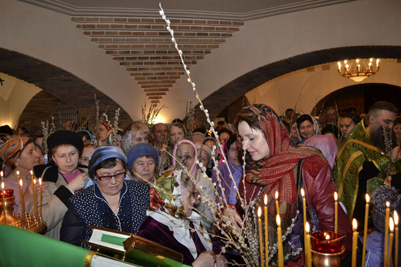 Богослужение совершили секретарь епархии, настоятель собора протоиерей Сергий Баранов и клирики храма: протоиерей Георгий Кожеватов, иерей Олег Соболевский, иерей Андрей Ионов, иерей Евгений Деревянко, диакон Григорий Сычев. Многие верующие, держа в руках веточки вербы, пришли помолиться в храм. Просторный собор еле вмещал пришедших. Особенно много в этот день было исповедников и причастников.