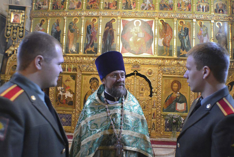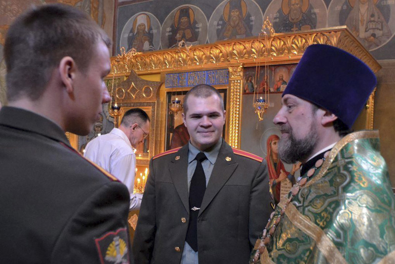 МОСКВА. 13 апреля 2014 г. На Праздник Входа Господня в Иерусалим 30 курсантов Военного университета Министерства обороны РФ посетили храм прп. Симеона Столпника, что на Поварской. Подготовившиеся ребята причастились Святых Христовых Таин. Духовным окормлением курсантов единственного в России военно-гуманитарного ВУЗа занимается клирик Орской епархии, заведующий сектором Сухопутных войск, помощник начальника Военного университета по работе с верующими военнослужащими протоиерей Димитрий Солонин.
