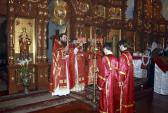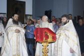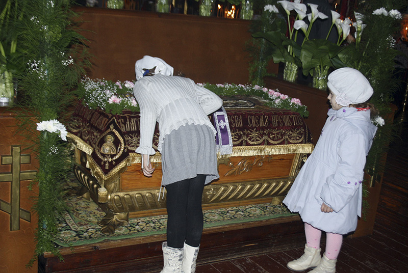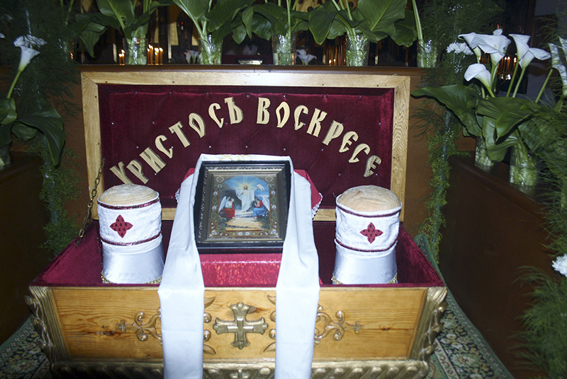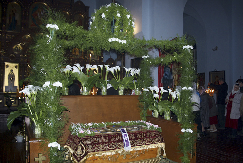 Храм в полумраке, святая Плащаница находится в центре, в главном приделе под сенью, украшенной живыми цветами. Эту сень уже по давней традиции устанавливают в самые торжественные праздники и знаменательные события прихода.