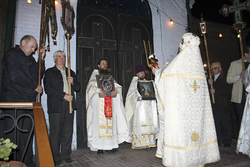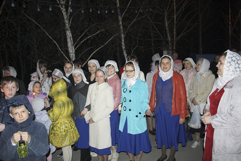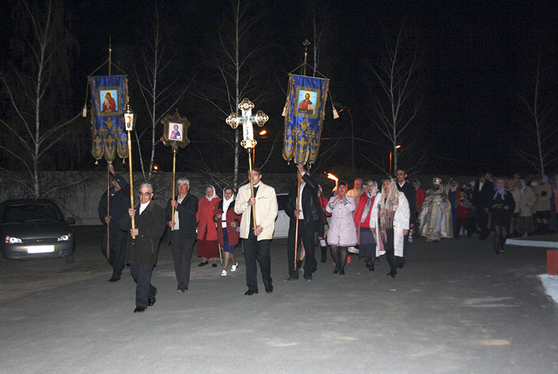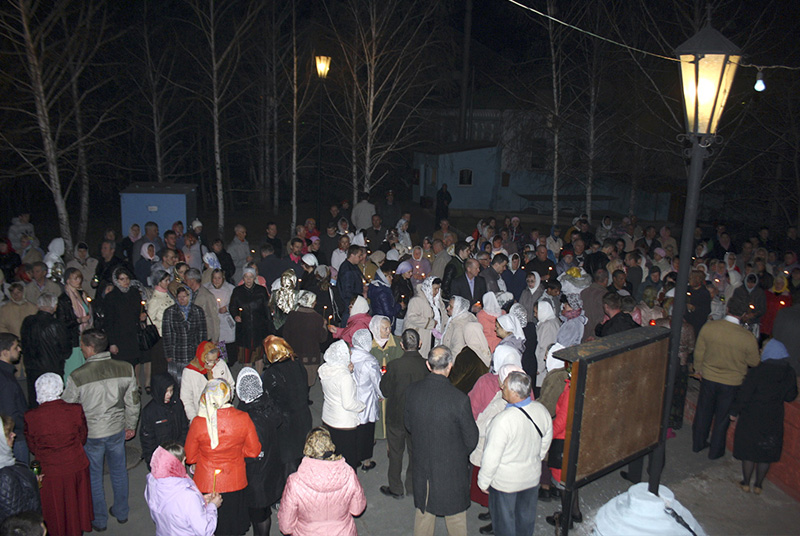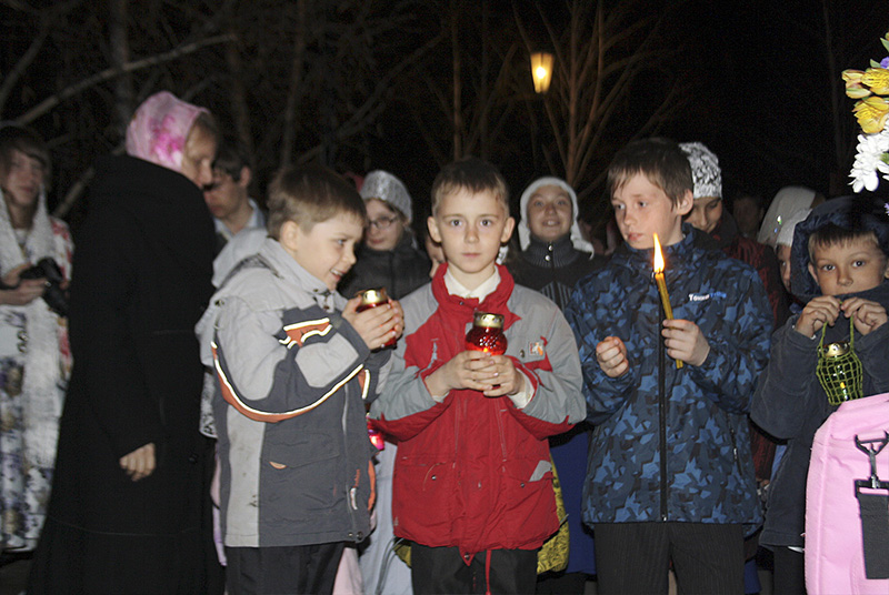 В полночь по установившейся традиции начался крестный ход. Когда все вышли из храма, то вся прилегающая площадь была заполнена людьми, стоящими с зажженными свечами. В первых рядах крестного хода – ученики воскресной школы. На праздничном богослужении даже ученики дошкольного класса держали в ручках зажженные свечи. Ночь, тишина… Безветрие – большая редкость в нашем городе. Свечи ярко горят, ощущается напряжение. Наконец вынесли иконы и хоругви, и крестный ход двинулся вокруг храма. Народу было так много, что когда крестный ход приблизился ко входу в храм, замыкающие еще только от него отходили. Завершилось праздничное шествие под колокольный звон с песнопением: «Воскресение Твое, Христе Спасе…».