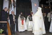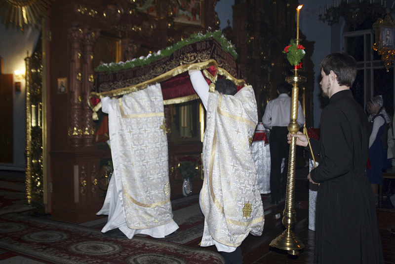 В 23-15 возле Плащаницы была совершена полунощница, после которой Плащаницу занесли в алтарь и положили на престол бокового придела, где она будет находиться до праздника Вознесения Господня.