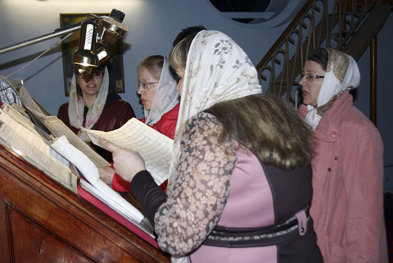 Везде стоят корзины с Пасхальными яствами в ожидании освящения, приходской хор в праздничном настроении: великолепно звучат голоса.