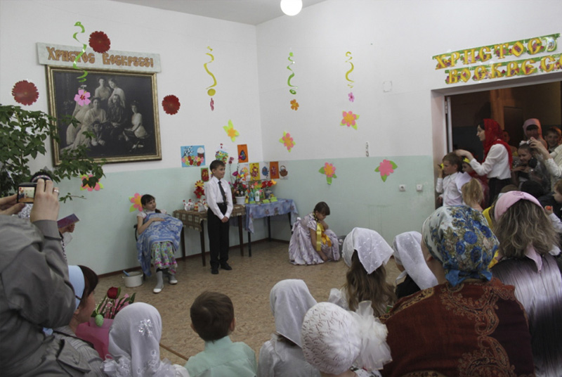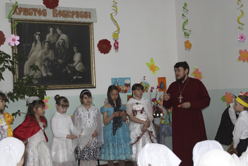 Самые маленькие ребята в сценке «Красное яичко» весьма оригинально рассказали историю о первом красном яйце. Средняя и старшая группы показали поучительную инсценировку «Кто всегда с нами». Несмотря на волнения, ребята со всей душой прославляли Христа. Весьма тепло и трогательно прозвучали слова поздравлений матушке Татьяне и педагогу Ольге Дмитриевне, которые в этот день отмечали свои дни рождения.