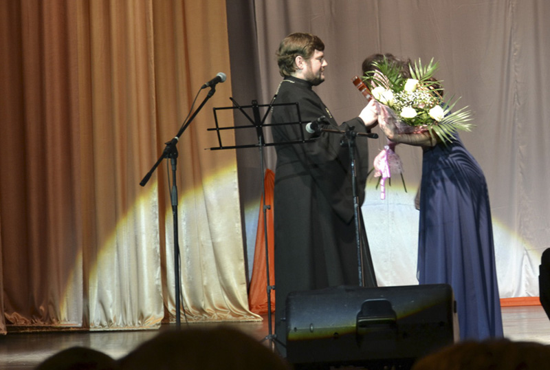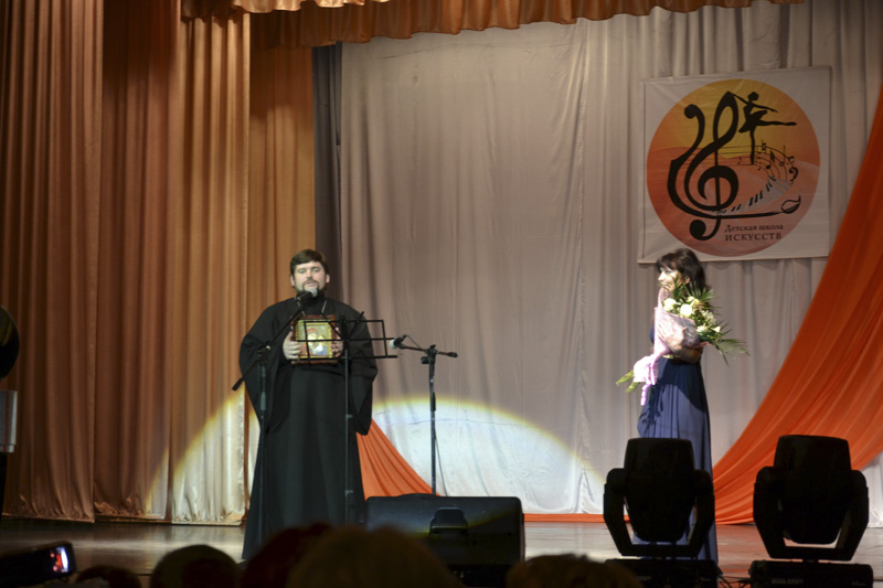 Отец Андрей поздравил педагогический коллектив с юбилеем, выразил благодарность всем педагогам, умеющим раскрыть талант каждого воспитанника и привить любовь к искусству. Священник поблагодарил директора и преподавателей за сотрудничество с Церковью и отметил, что в этом году исполняется 10 лет со дня создания профессионального церковного хора педагогов и учеников Детской школы искусств. Вот уже десять лет коллектив радует верующих жителей города профессиональным пением за богослужениями.