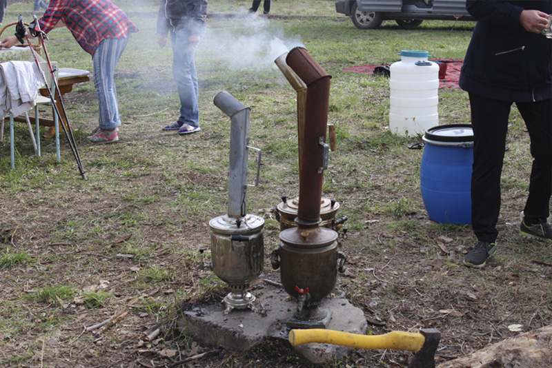 После службы все направились на полянку, где уже был накрыт стол на пятьдесят человек и дымились три самовара. Женщины - прихожанки нашего храма, певчие, учителя воскресной школы - после совместной молитвы и благословения трапезы с удовольствием и благодарностью вкушали яства, которые подавали мужчины.
