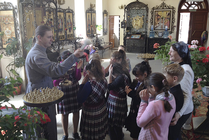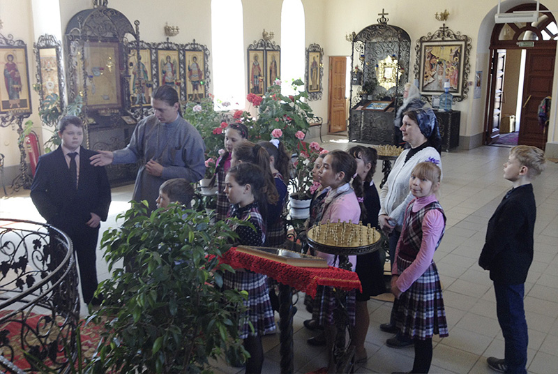 Клирик храма иерей Александр Курсаков рассказал учащимся о православных церквях, какие можно встретить, посещая разнообразные места нашей планеты. После рассмотрения внешнего вида храма и назначения его частей экскурсия продолжилась внутри помещения. Было рассказано об истории возникновения храмов, о том, как они строились и кто принимал активное участие в их постройке. Особенно дети удивились тому, что раньше некоторым людям долгое время нельзя было входить в храм, так как они совершили тяжкий грех, и только после исправления они снова могли посещать богослужения.